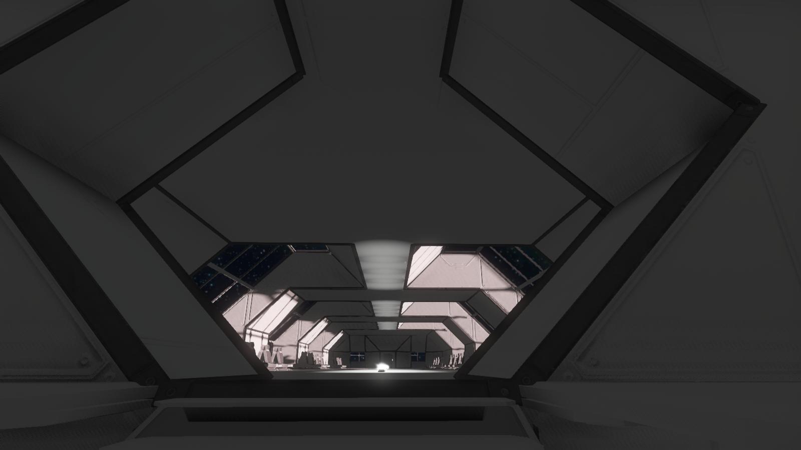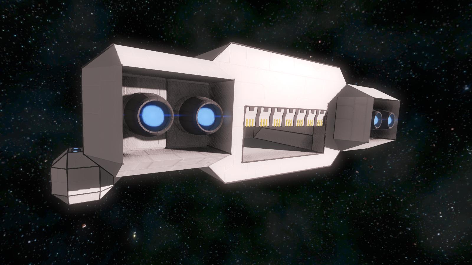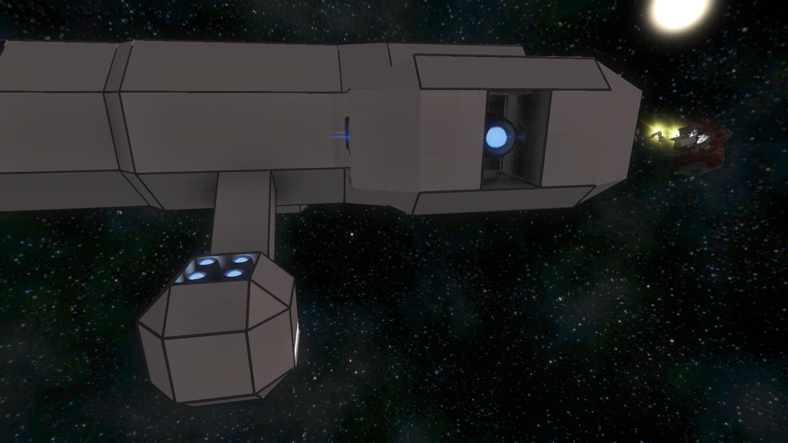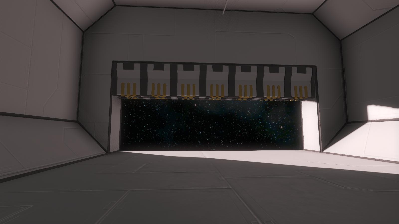 - Ein mit zwei Türen (Schiff -> Hangar, Hangar -> Weltraum) ausgestatteter Hangar, in dem auch die Antenne untergebracht ist