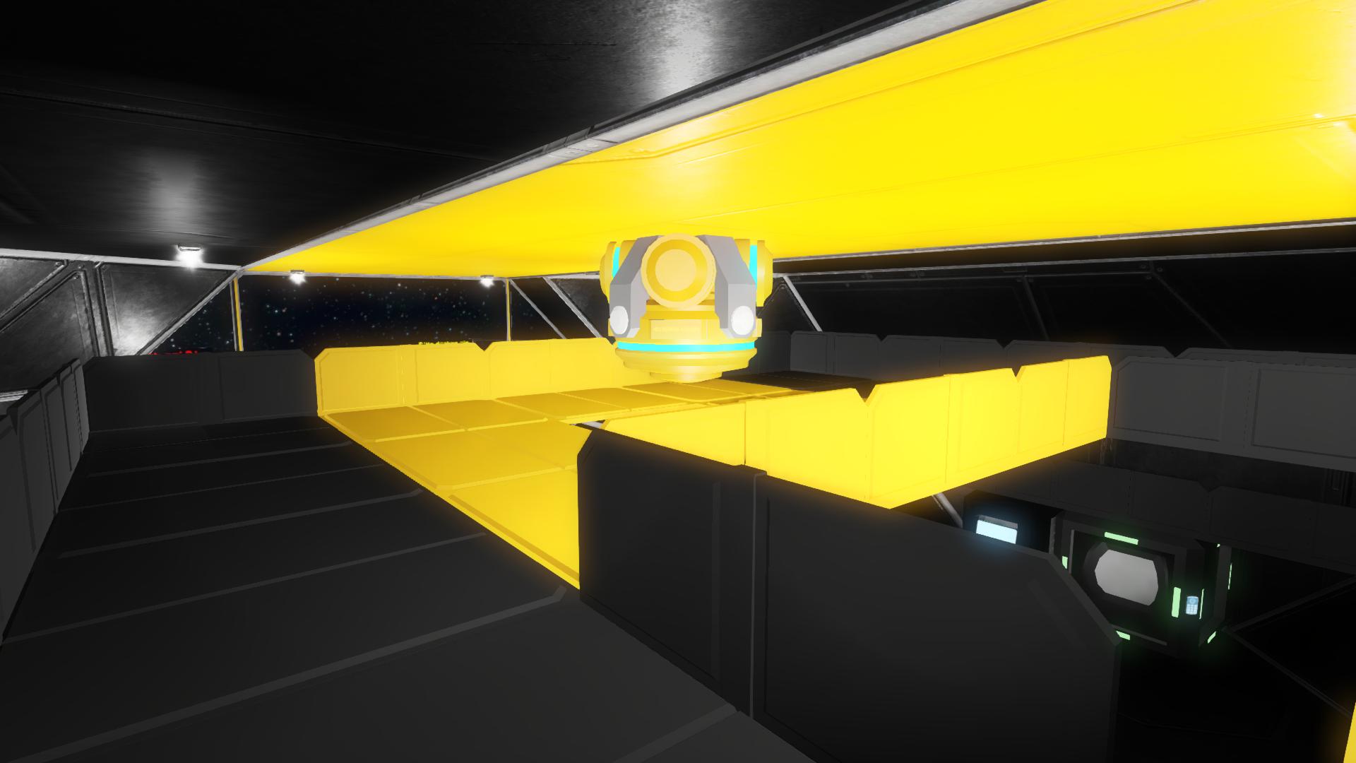 Auf dem rechten Bild ist dann auch der Grund für die "Arme" vor dem Cockpit zu sehen: Zwei LCD-Panele sind, sozusagen als HUD, vor dem Cockpit platziert. Da die Arme aus Glas sind, stören sie den Blick nicht allzu sehr. Auf den Bildschirmen werden standardmäßig Warnungen angezeigt, in der Nähe anderer Schiffe die Waffen zu deaktivieren (Button in der Hotbar des Cockpits) und die lange Strecke zum Abbremsen im Kopf zu behalten; über einen der zwei Programmierbaren Blöcke könnte aber auch ein Script Informationen auf dem HUD anzeigen. Der zweite ist dafür gedacht, ein Script wie den Reactors Balancer auszuführen.