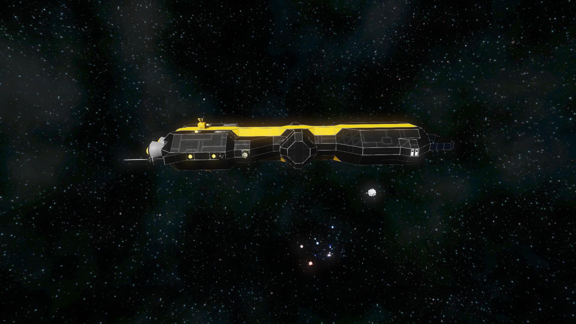 Ich bin ja sonst nicht gerade der begabteste, was das Entwerfen von Raumschiffen angeht, und auch dieses hier ist nicht gerade ein gestaltlerischer Höhenflug, aber weil es (technisch) mMn nicht viel daran auszusetzen gibt wollte ich es trotzdem mal vorstellen und vielleicht ein bisschen Rückmeldung erhalten.
