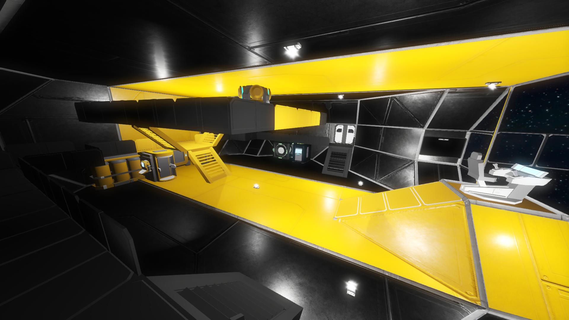 Das Schiff ist mit zwei Gatlingtürmen am Heck bewaffnet. In der Hotbar des Cockpits befindet sich ein Knopf, um die Waffen zu deaktivieren. Beide Antennen sind aktiv, aber nur eine zeigt Text an.
