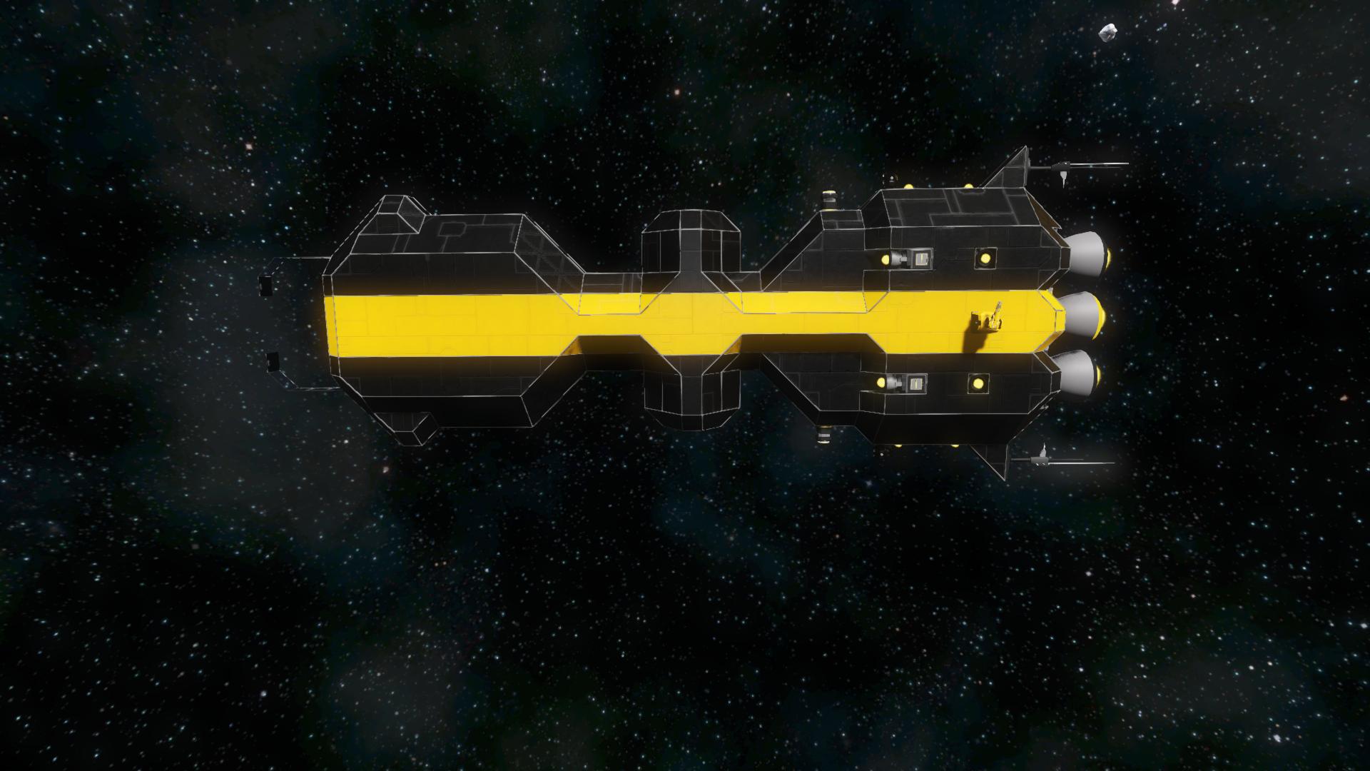 Ich bin ja sonst nicht gerade der begabteste, was das Entwerfen von Raumschiffen angeht, und auch dieses hier ist nicht gerade ein gestaltlerischer Höhenflug, aber weil es (technisch) mMn nicht viel daran auszusetzen gibt wollte ich es trotzdem mal vorstellen und vielleicht ein bisschen Rückmeldung erhalten.