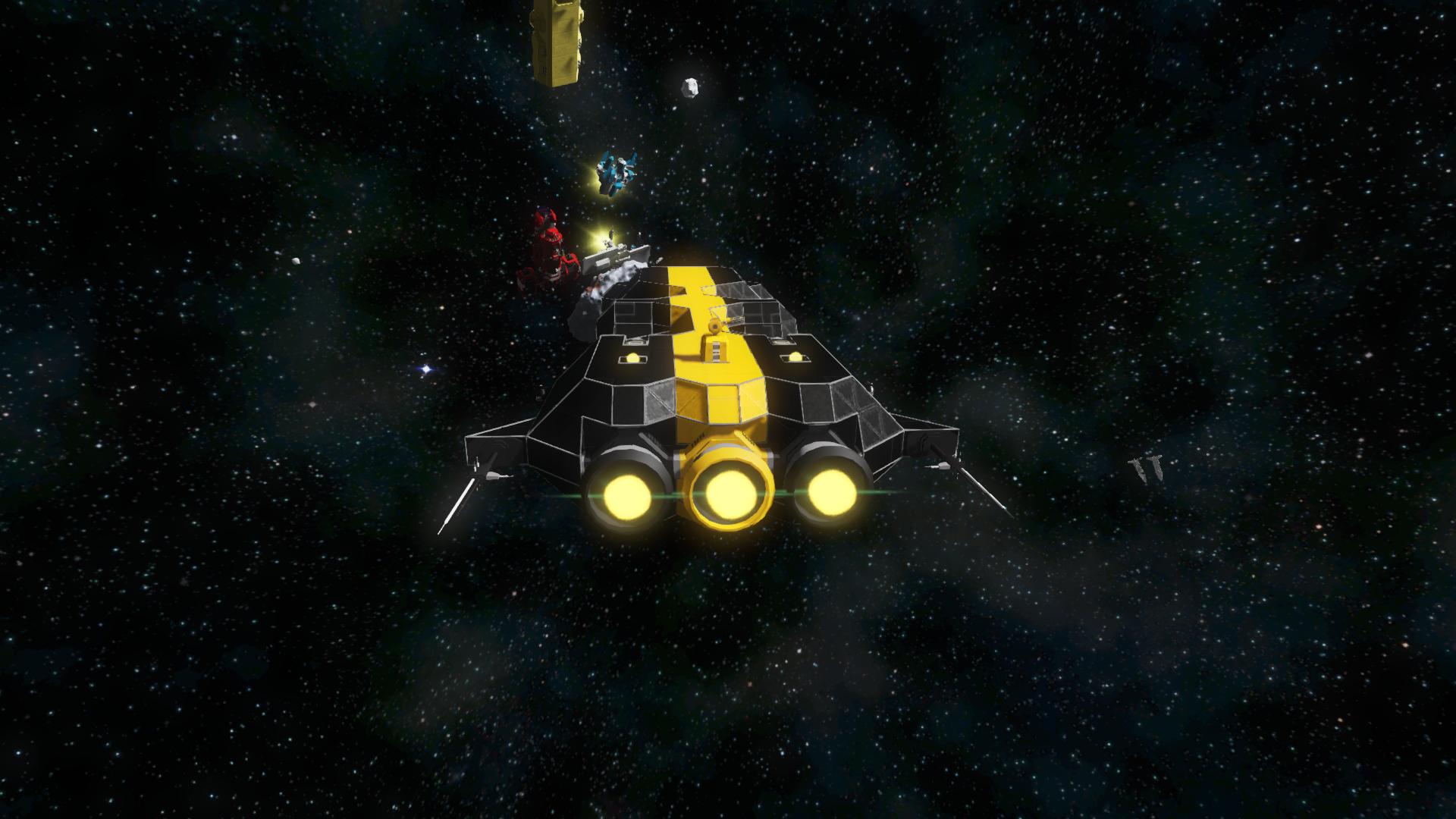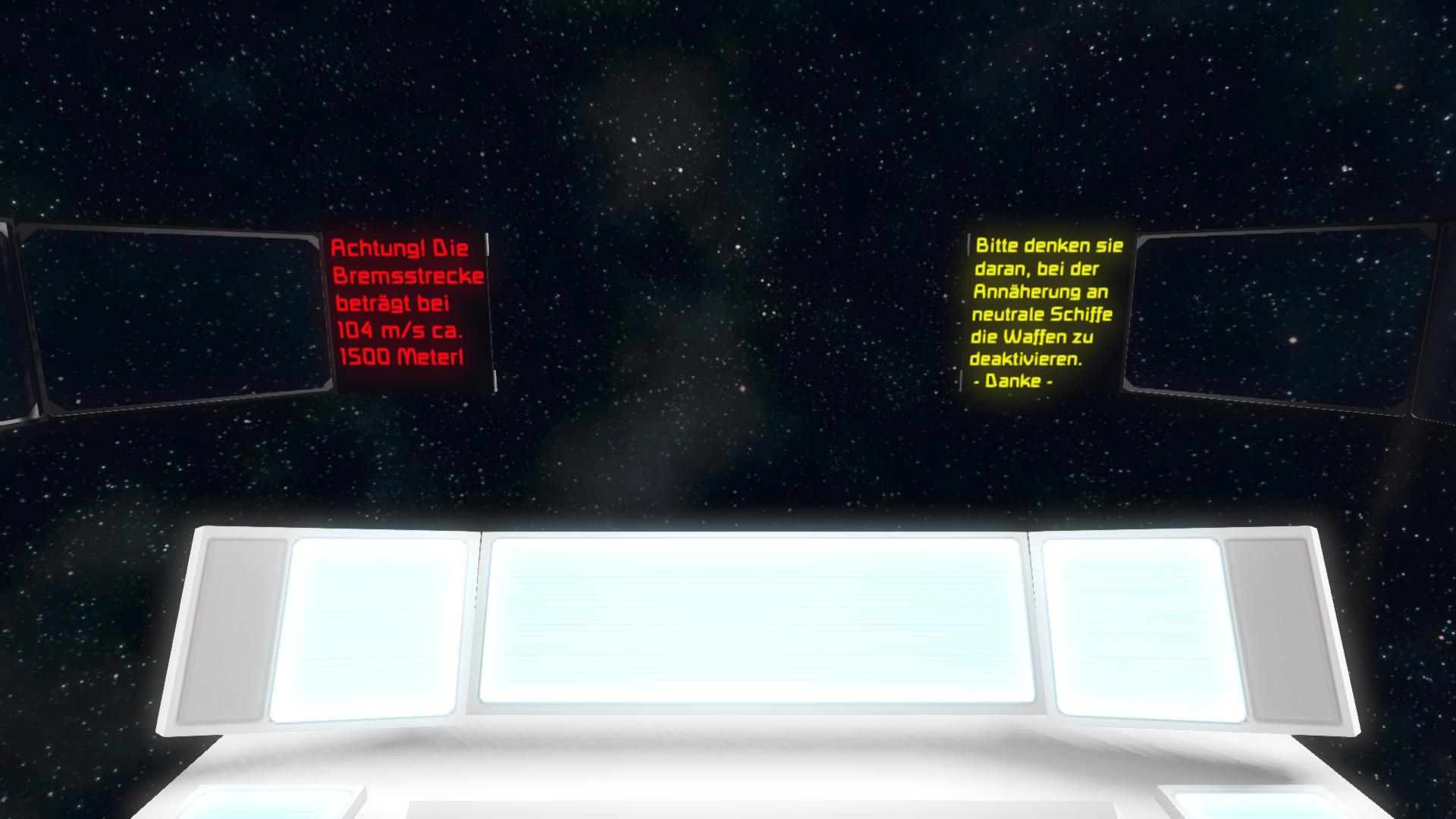 Auf dem rechten Bild ist dann auch der Grund für die "Arme" vor dem Cockpit zu sehen: Zwei LCD-Panele sind, sozusagen als HUD, vor dem Cockpit platziert. Da die Arme aus Glas sind, stören sie den Blick nicht allzu sehr. Auf den Bildschirmen werden standardmäßig Warnungen angezeigt, in der Nähe anderer Schiffe die Waffen zu deaktivieren (Button in der Hotbar des Cockpits) und die lange Strecke zum Abbremsen im Kopf zu behalten; über einen der zwei Programmierbaren Blöcke könnte aber auch ein Script Informationen auf dem HUD anzeigen. Der zweite ist dafür gedacht, ein Script wie den Reactors Balancer auszuführen.