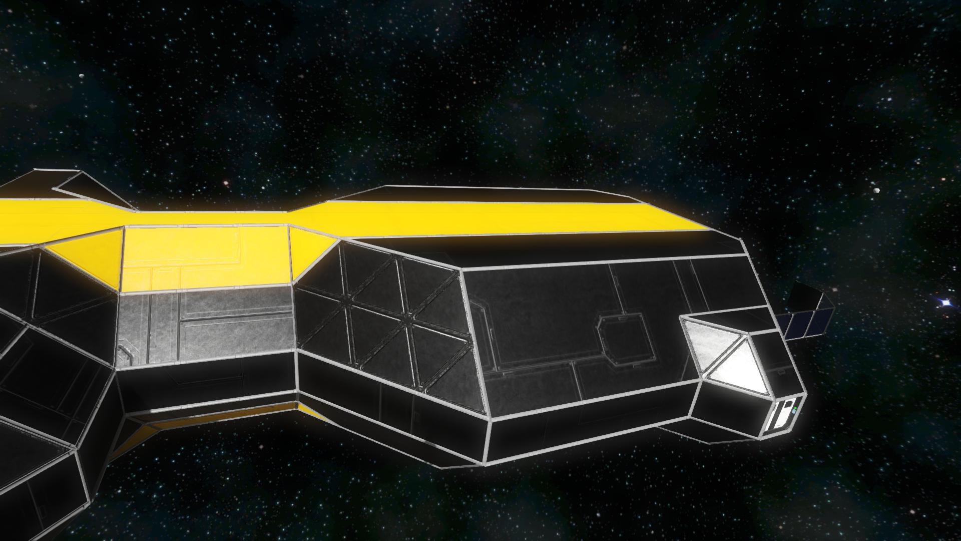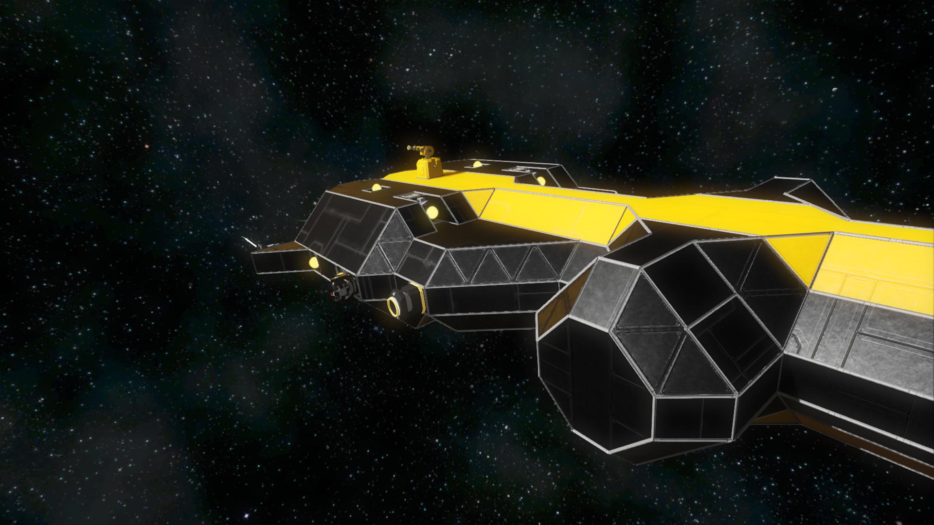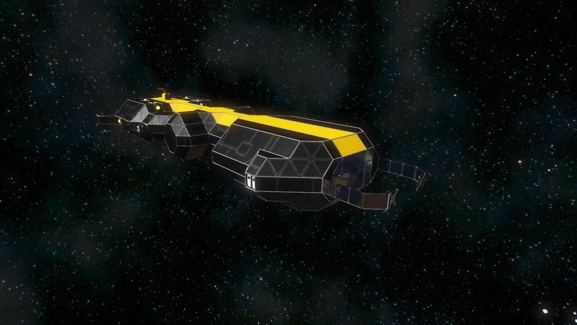 Ich bin ja sonst nicht gerade der begabteste, was das Entwerfen von Raumschiffen angeht, und auch dieses hier ist nicht gerade ein gestaltlerischer Höhenflug, aber weil es (technisch) mMn nicht viel daran auszusetzen gibt wollte ich es trotzdem mal vorstellen und vielleicht ein bisschen Rückmeldung erhalten.