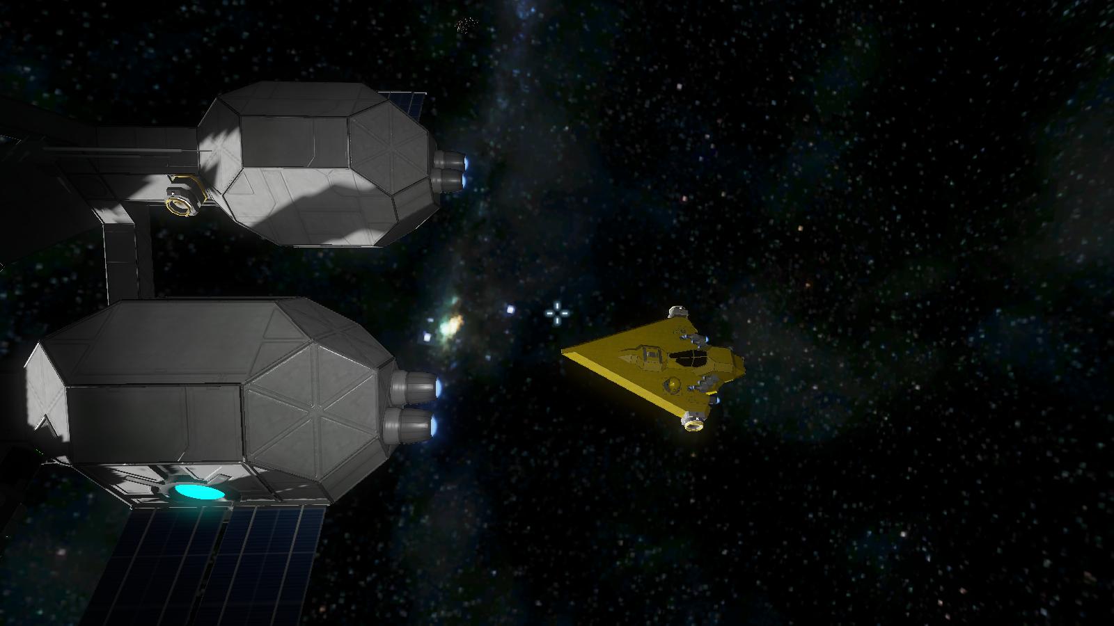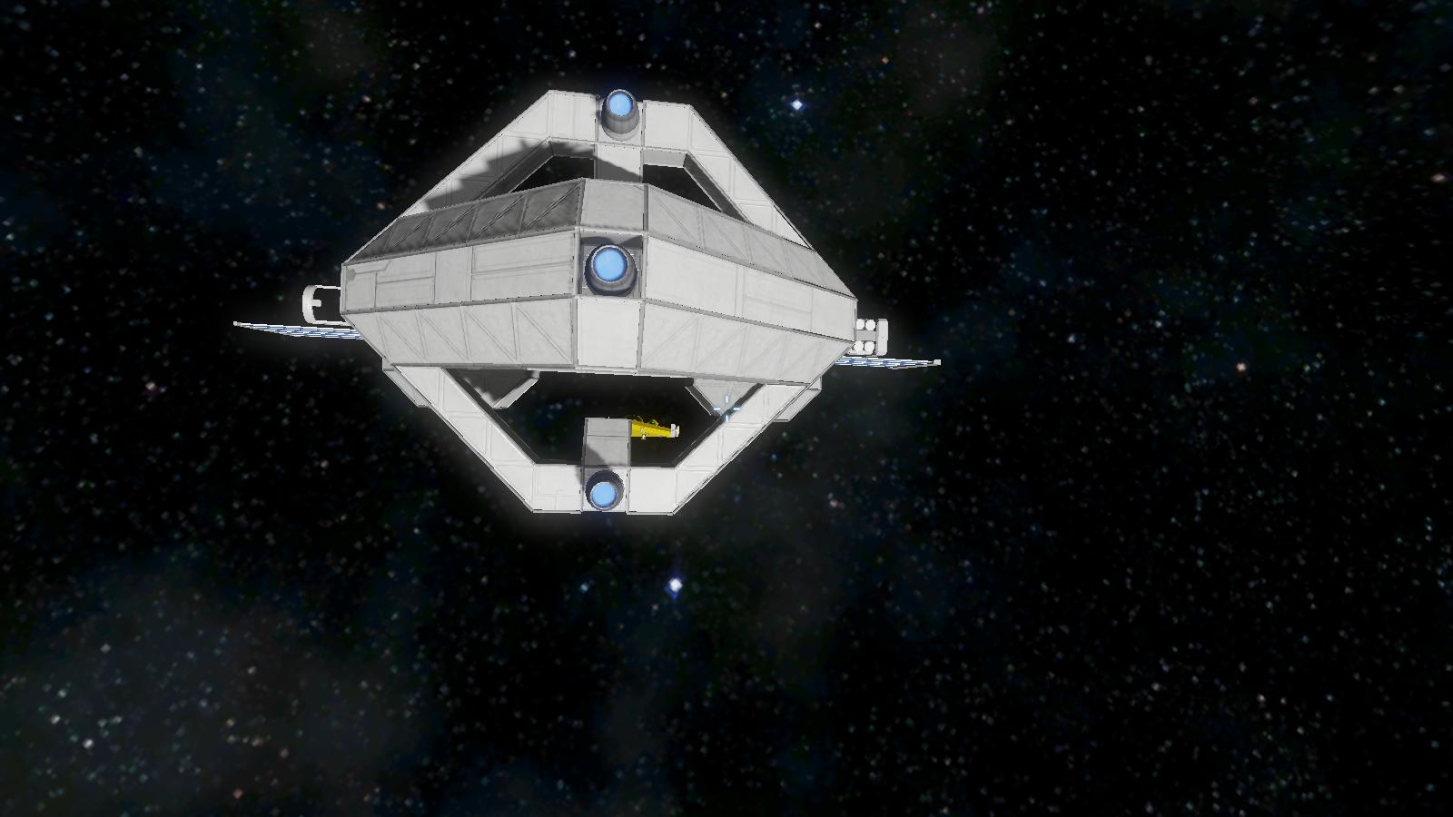 Angelehnt an die (denke mal allseits bekannten) Hyperraumringe aus der neuen Star Wars-Trilogie (Ich meine I – III) habe ich ein Schleppschiff mit Sprungantrieb gebaut. Es ist nicht besonders hübsch und praktisch unbeweglich (2 Gyroskope + 1 Triebwerk / Achse), aber mit zwei Sprungantrieben und ebensovielen Sauerstofferzeugern ausgerüstet (um O² zu erzeugen, während es im Orbit wartet). Zwischen die zwei Verbinder passen kleine Schiffe bis ca. 25 - 27 Block Breite oder große Schiffe von 3 - 4.5 Block Breite (gibt es so was?). Die Energieversorgung läuft über 4 Batterien und 4 Solarpaneele. Die maximale Sprungreichweite liegt bei 4000 Kilometern.