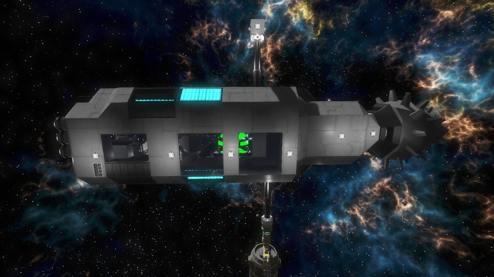 Es ist das bisher größte Schiff, dass ich fertiggestellt habe. Auf dem Bild ist er noch angedockt, kurz vor dem Jungfernflug. *g*