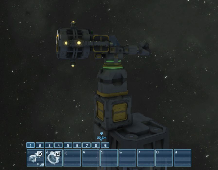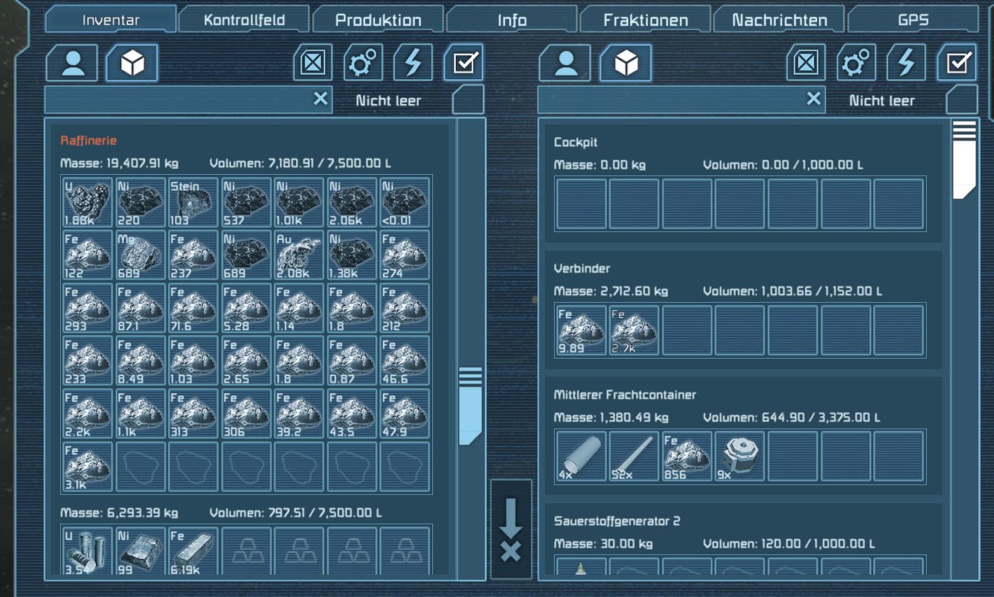 Ich habe nun ein Schiff mit Frachtbehälter, verbunden mit einem Verbinder. Auf der anderen Seite ist meine Raffinerie auch mit Verbinder. Eben habe ich noch extra ein Transportband zwischengesetzt.