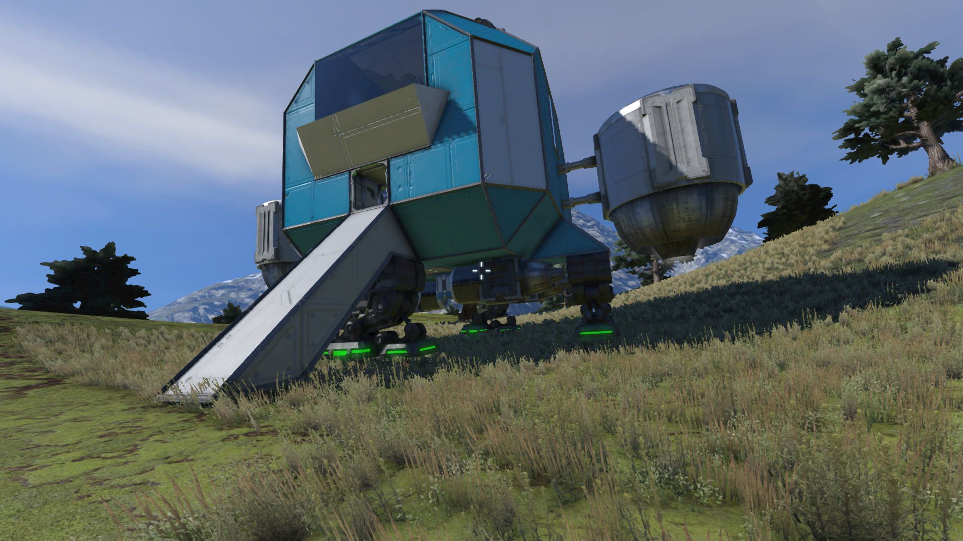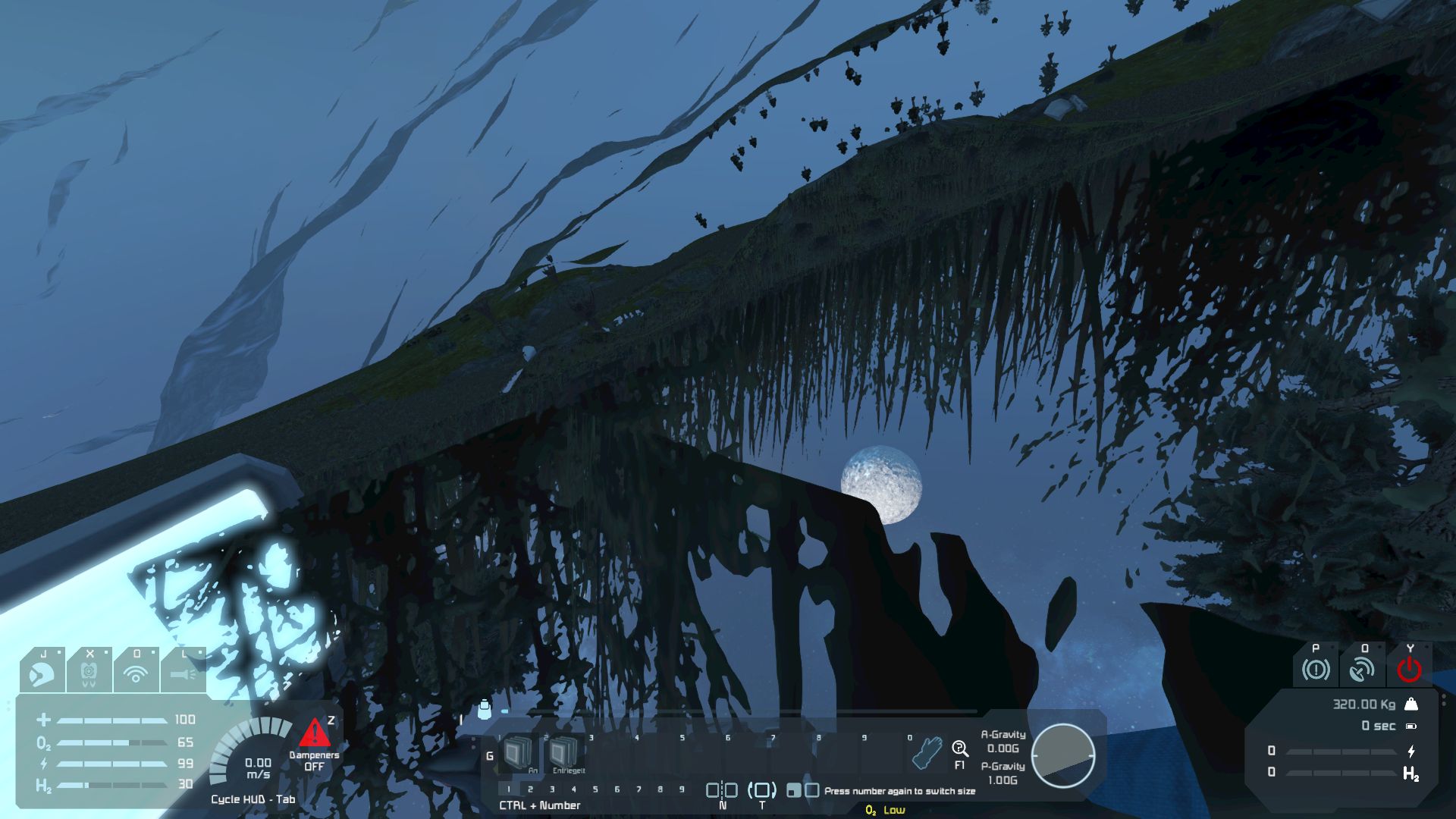 Die Einstellungen habe ich alle auf realistisch gestellt, ohne die metallfressenden Wölfe. Bei der Landung am Hang steht das Schiff absolut gerade und denkt nicht einmal daran sich dem Gelände anzupassen