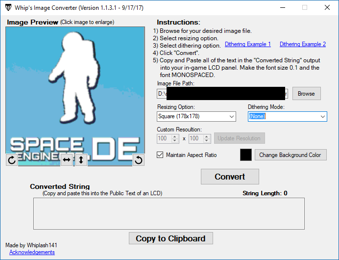 - Kopieren und fügen Sie den gesamten Text in der Ausgabe "Converted String" in Ihr In-Game-LCD-Panel ein. Machen Sie die Schriftgröße auf 0.1 und die Schriftart auf MONOSPACED.