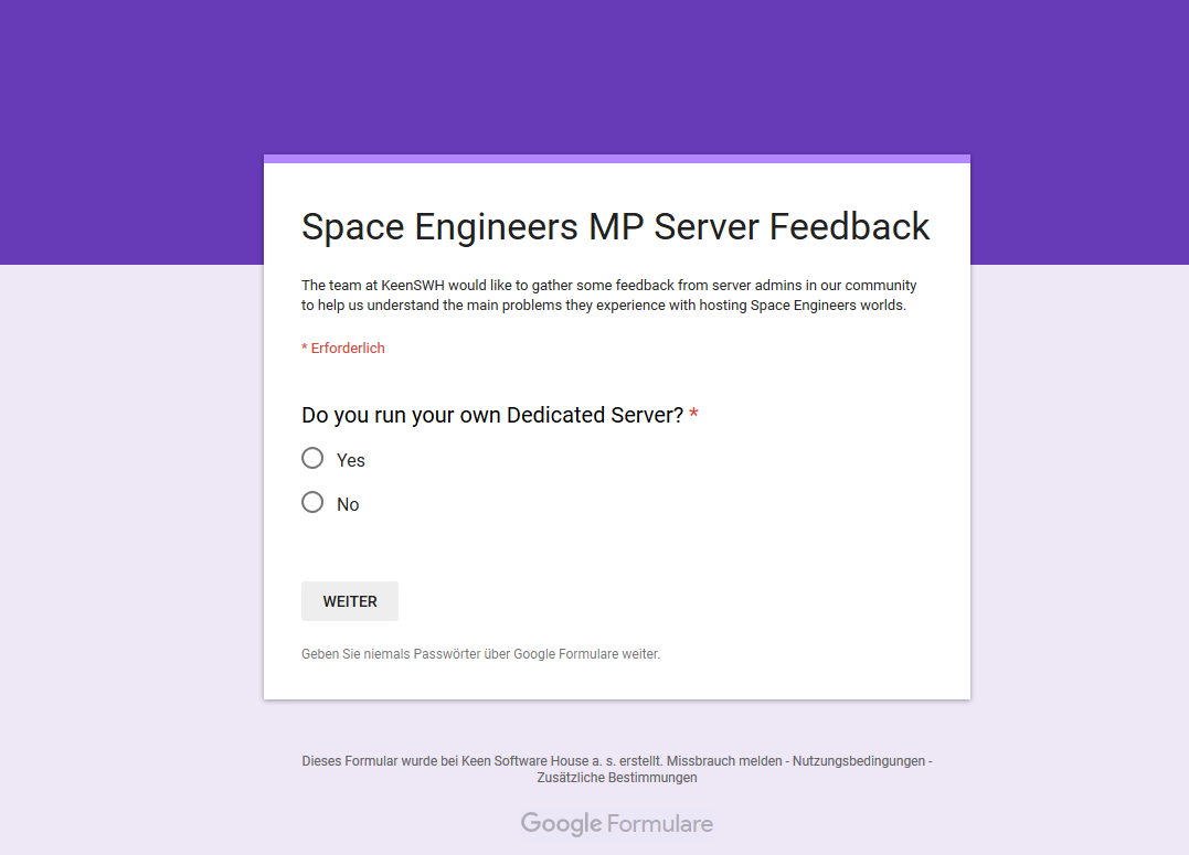 es gibt eine Umfrage von Keen Software House an alle Serverbetreiber.