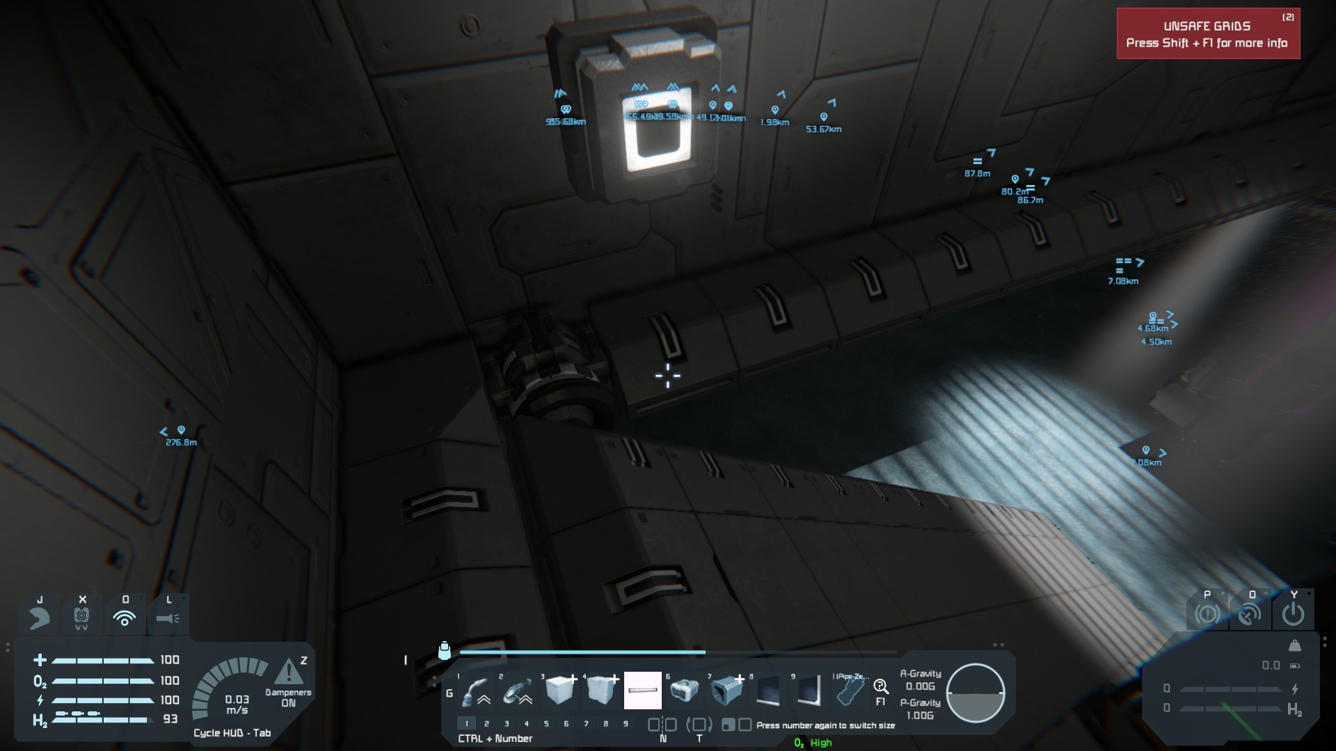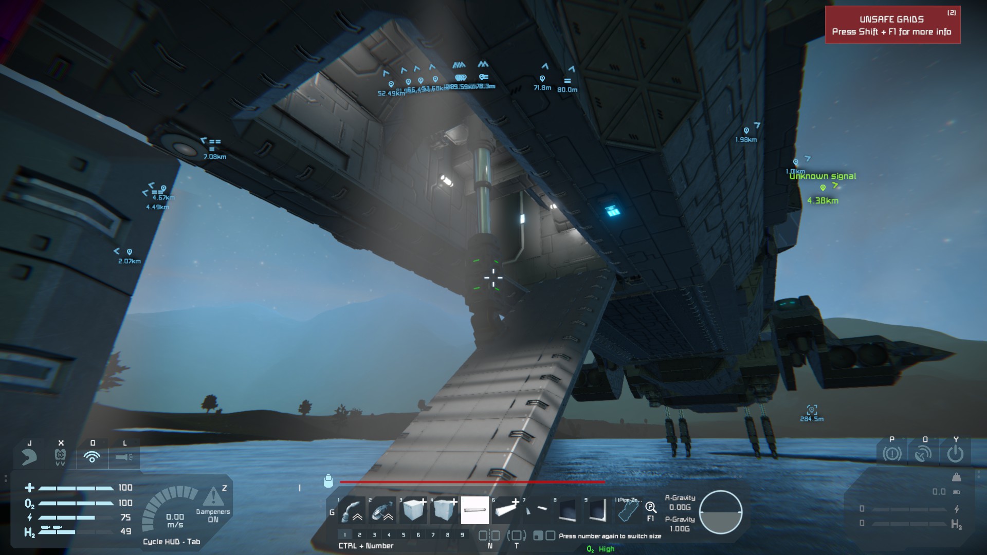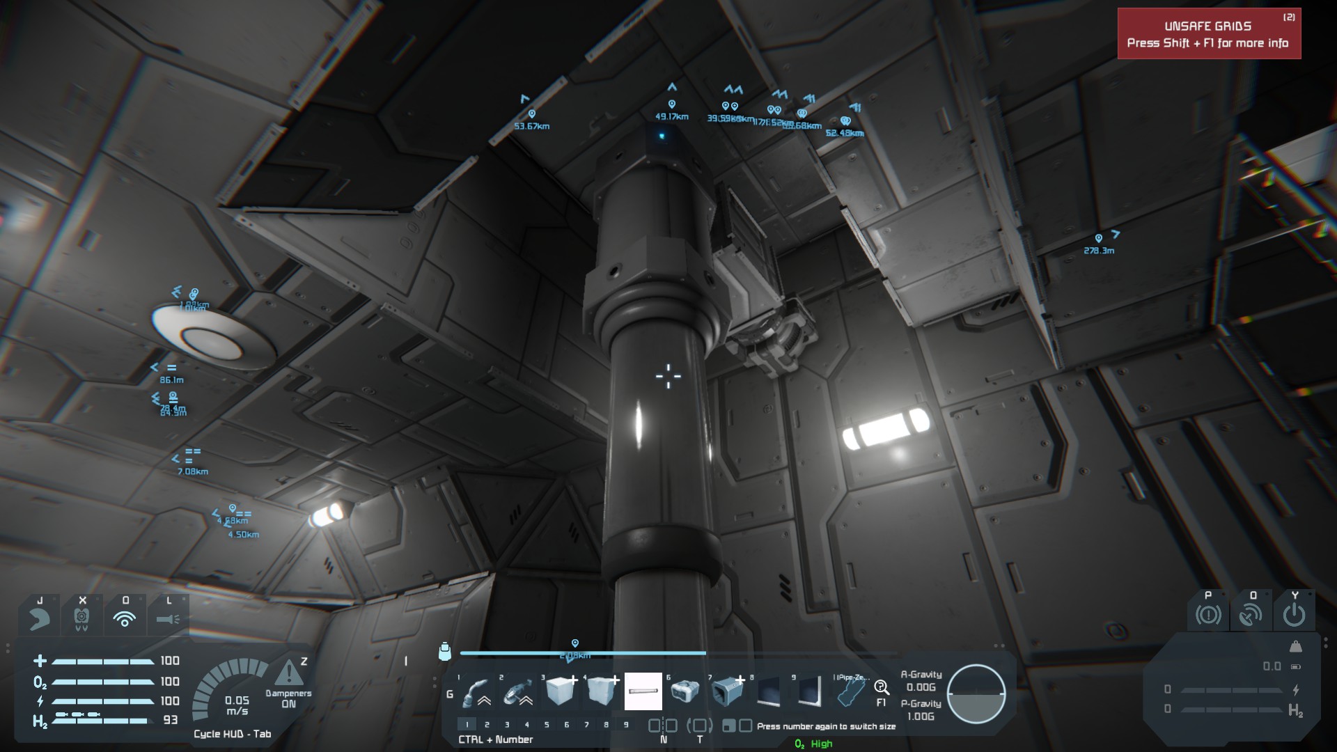 Da aber für jedes Objekt (entity) ein separater Massenschwerpunkt berechnet wird, was auch alle Teile die am anderen Ende eines Rotors oder Pistons hängen git, hat dein Schiff nun mehrere Massenschwerpunkte die einen gemeinsamen Massenschwerpunkt haben. Dieser gemeinsame Massenschwerpunkt wird aber nicht von den Triebwerken berücksichtigt. Dessen Schub wird nur auf den Objektschwerpunkt zurück gerechnet an den diese verbunden sind. Das Resultat ist ein inkorrekter Schwerpunkt Ausgleich. (Ein gutes Beispiel ist, wenn du eine Laderampe am ende deines Schiffes hast. Wenn du dann herumfliegst, hast du das Gefühl, dass dein Hintern schwer ist und dich nach unten ziehen will.
