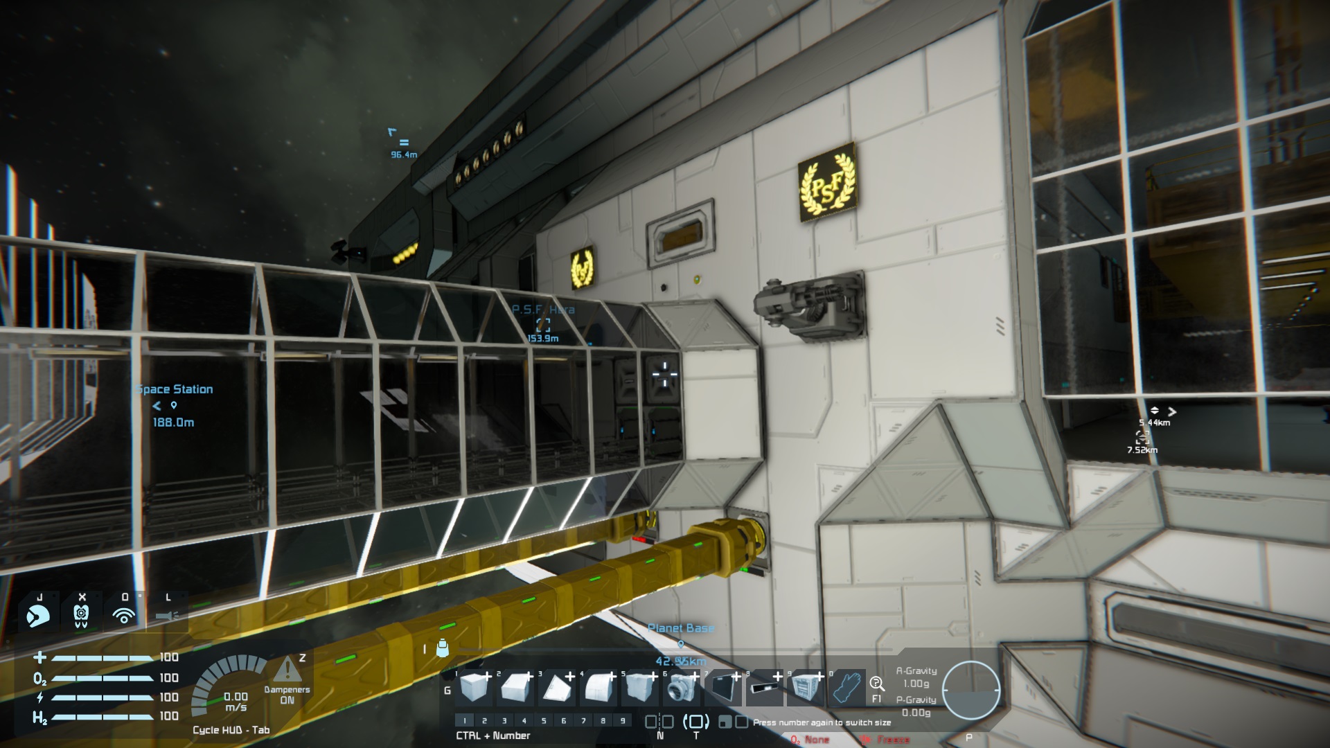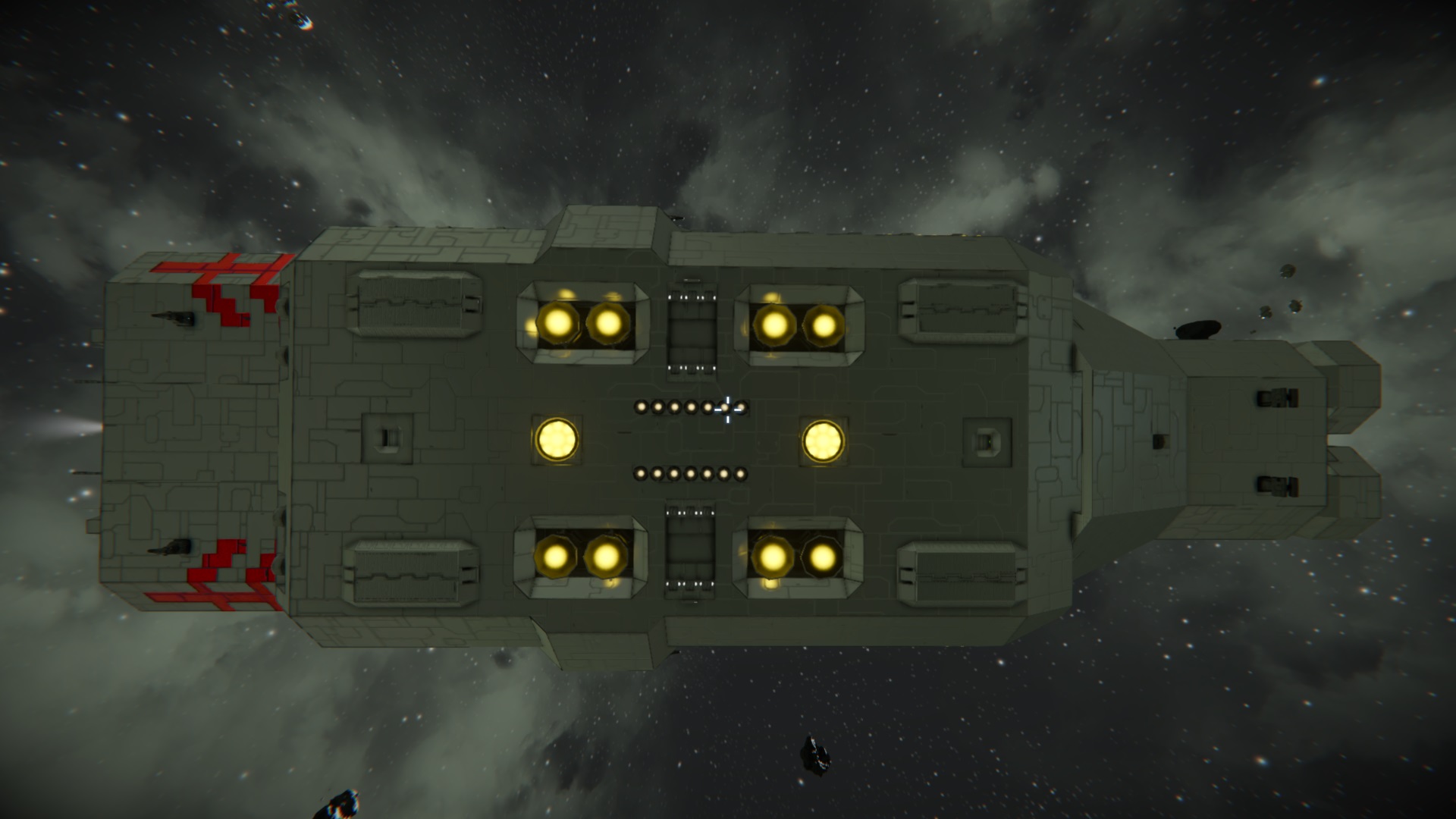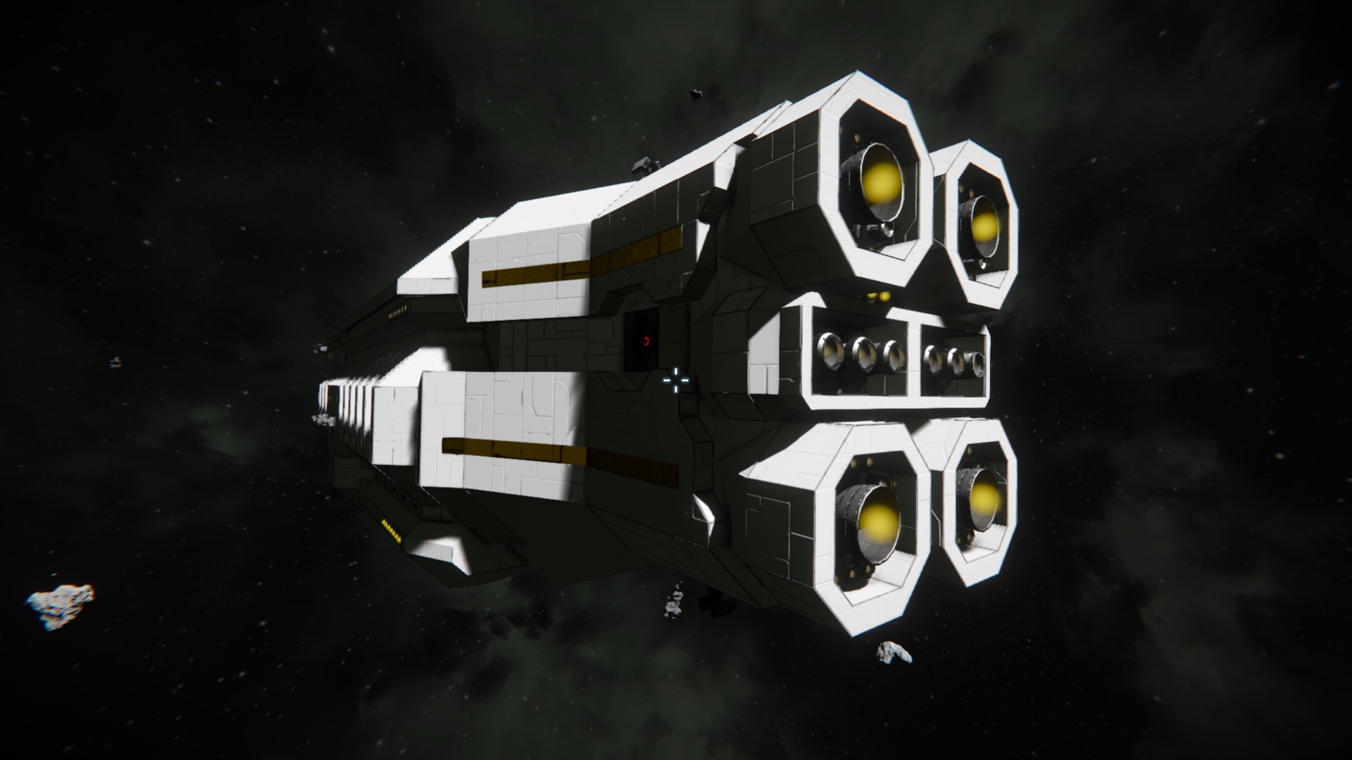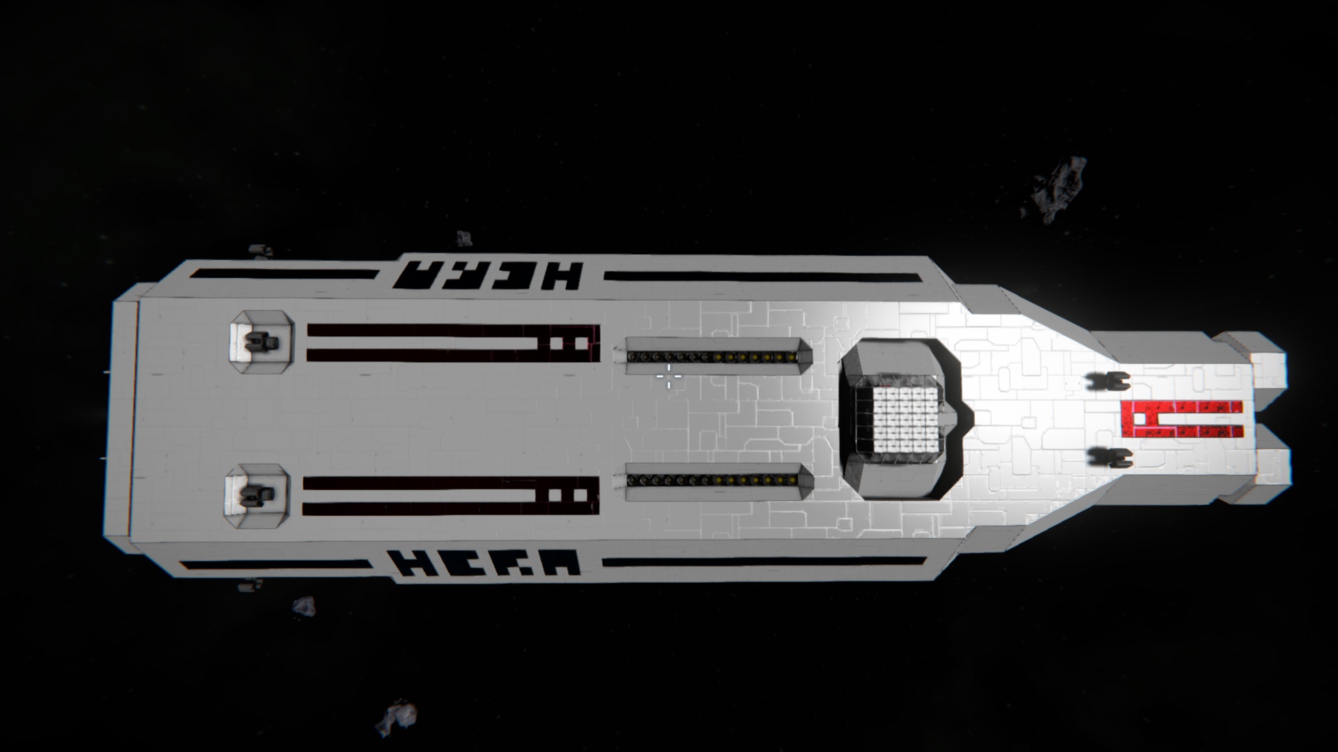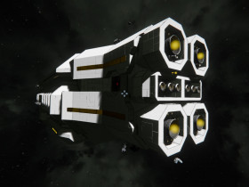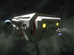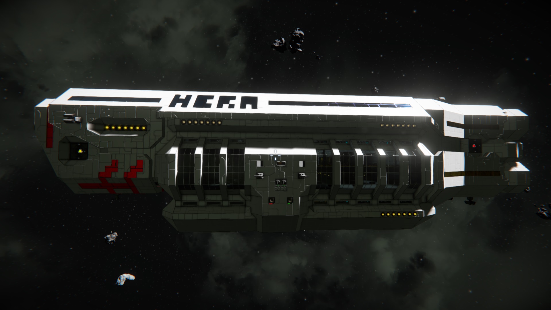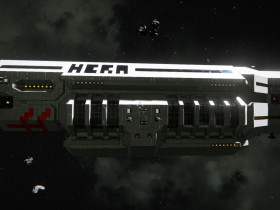 Während dem Flug zwischen Planet und Raumstation kann die Hera, dank 2 Raffinerien, 2 Montageanlagen und diversen Frachtkontainern, als Fracht- und Fabrik-Schiff dienen.