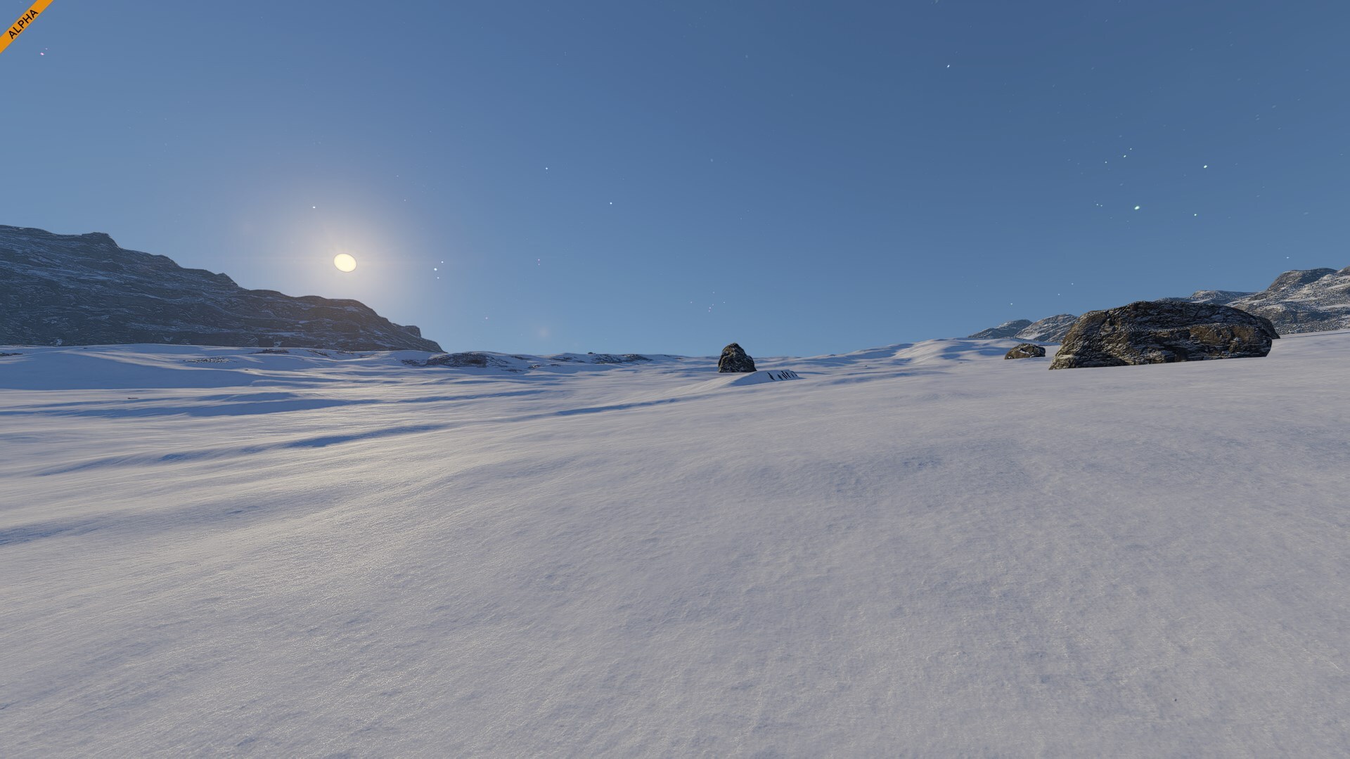 The tundra stretches across wide, open plains. The surface is covered in layers of snow, interrupted only by scattered rocks and frozen soil. Under the bright sky or the glowing night stars, this landscape feels endless and quiet.