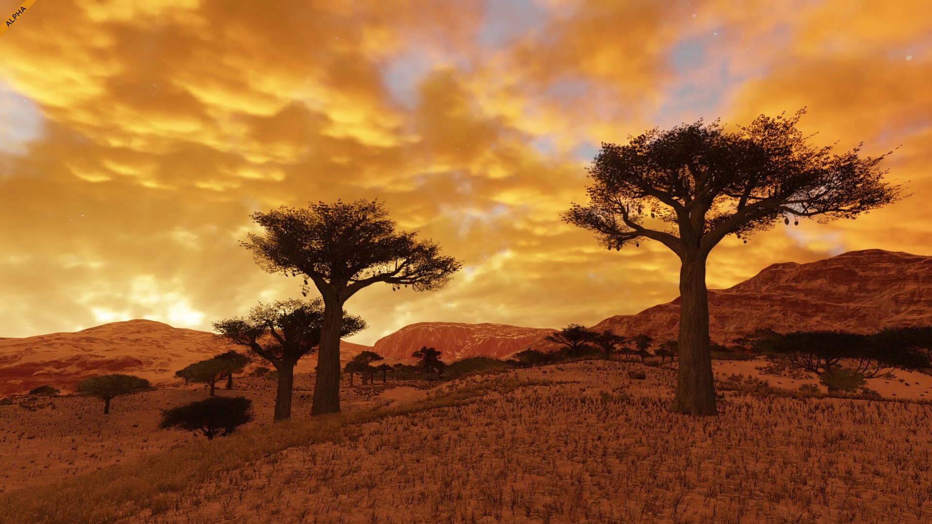 The savanna stretches across vast plains dotted with tall, resilient trees and dry grasses. Warm sunlight bathes the landscape in gold, and the long shadows of acacias mark the slow rhythm of the day. At sunset, the entire horizon glows in deep orange and red, turning the terrain into a living painting.