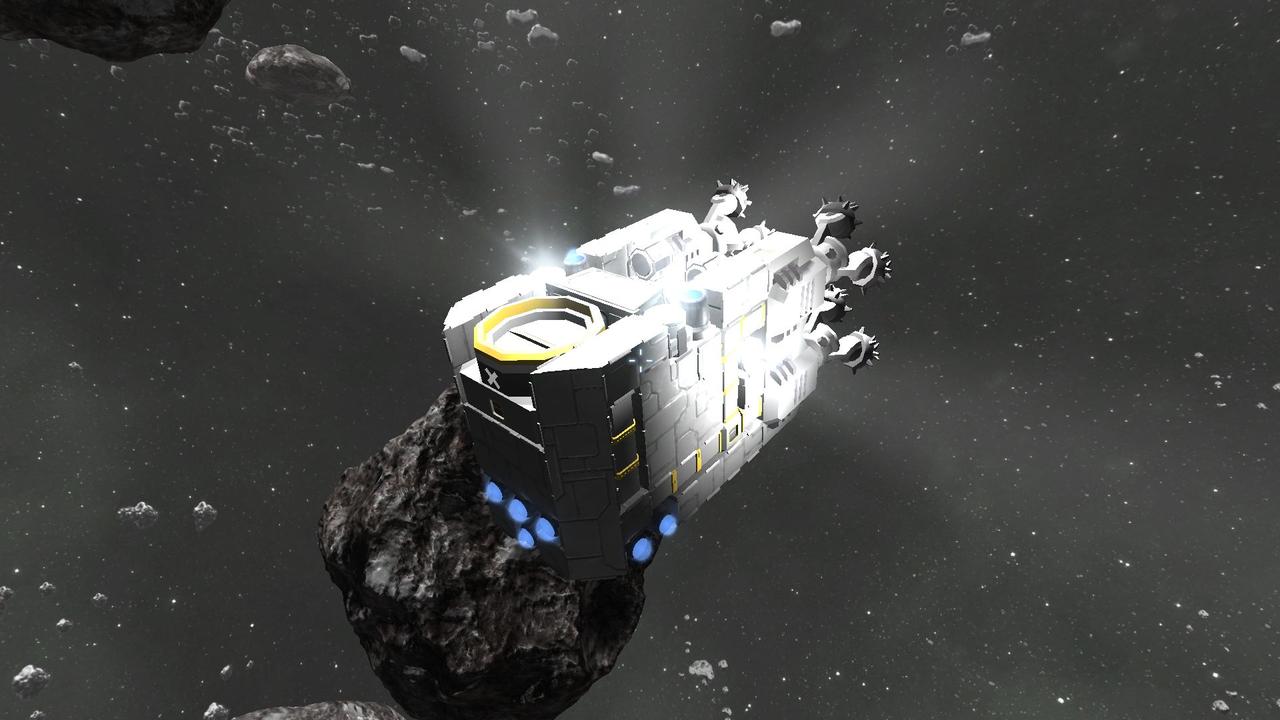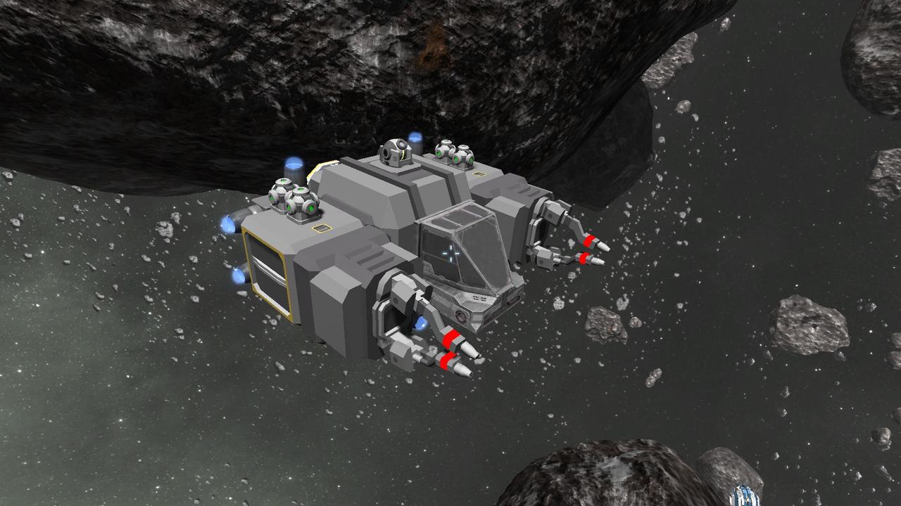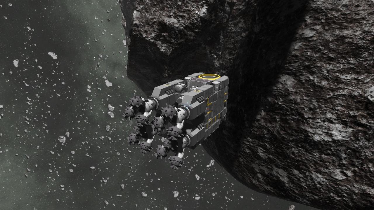 ) Vier Bohrköpfe, Förderbänder in einen mittleren Frachtcontainer, sechs Scheinwerfer nach vorne, oben und zu den seiten gerichtet, genug Thruster um mit genug Power in die Asteroiden zu gelangen und ein Verbinder nach oben gerichtet.